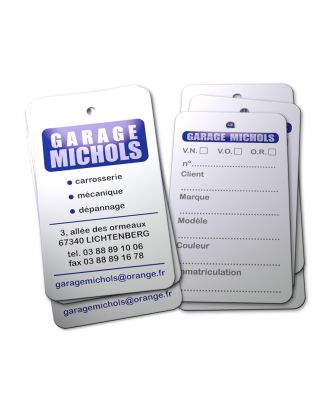 L'étiquette de clé AST personnalisée est une étiquette de marquage recto verso où vous pouvez identifier les clés des véhicules en réparation ou préparation mais aussi vos VO ou VN. L'étiquette de clé AST personnalisée est réalisée sur une carte rigide 350 g/m² avec angles arrondis de 4 mm et pour dimensions en mm : largeur 40, longueur 70. L'étiquette de clé AST personnalisée a en son sommet une perforation de 30 mm de diamètre permettant de lier votre clé grâce au lien plastique fourni. L'étiquette de clé AST personnalisée est imprimée à vos couleurs d'après vos fichiers informatiques pros fournis (possibilité d'effectuer la maquette de vos étiquettes AST personnalisées). Le lot de 2000 étiquettes de clés AST personnalisés avec liens plastiques